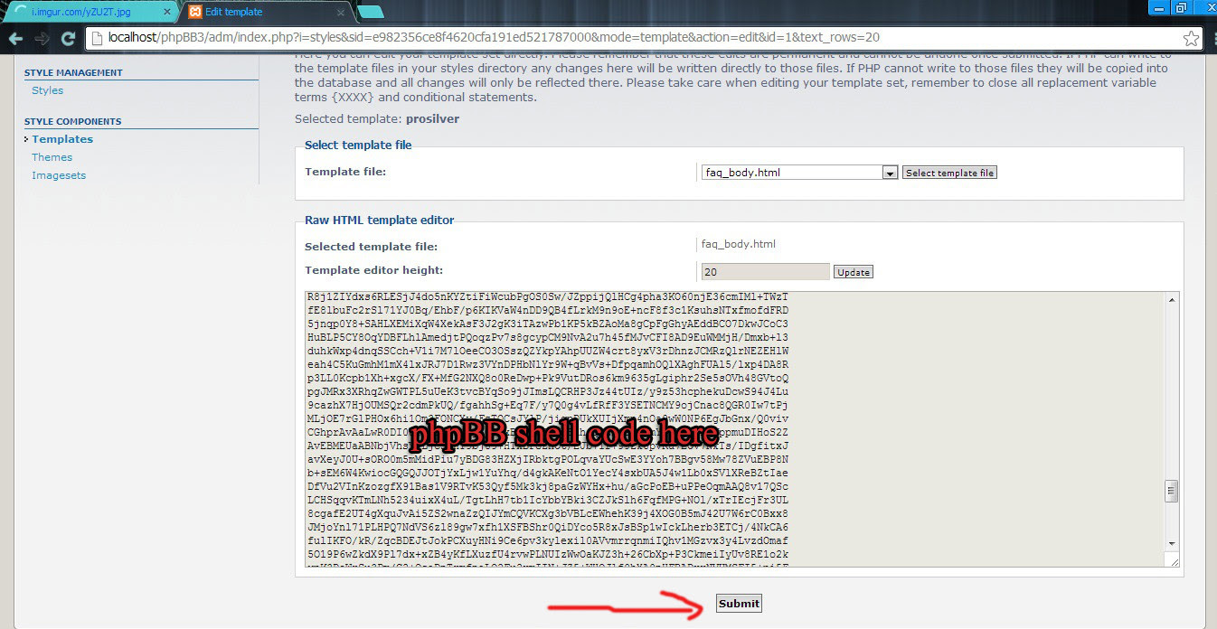 ကြ်န္ေတာ္ကေတာ့ Skill ေတြတအားၾကမ္းလုိ႔ localhost မွာပဲ စမ္းျပႏုိင္ပါတယ္။ ဒါေၾကာင့္ ဒီနည္းလမ္းနဲ႔ လုံးဝအဆင္ေျပလိမ့္မယ္လုိ႔လည္း ကြ်န္ေတာ္မေျပာတတ္ပါဘူး။ phpBB site Admin access ရသြားျပီးရင္ shell upload လုပ္နည္းပါ။ admin access ရသြားျပီးလုိ႔ ယူဆပါမယ္။ ဆုိဒ္ admin account နဲ႔ login ဝင္လုိက္ပါျပီ။ :D အထဲကုိေရာက္ျပီဆုိရင္ Security Settings ထဲက Allow php in templates>Yes လုပ္ျပီး Submit ကုိကလစ္ပါ။